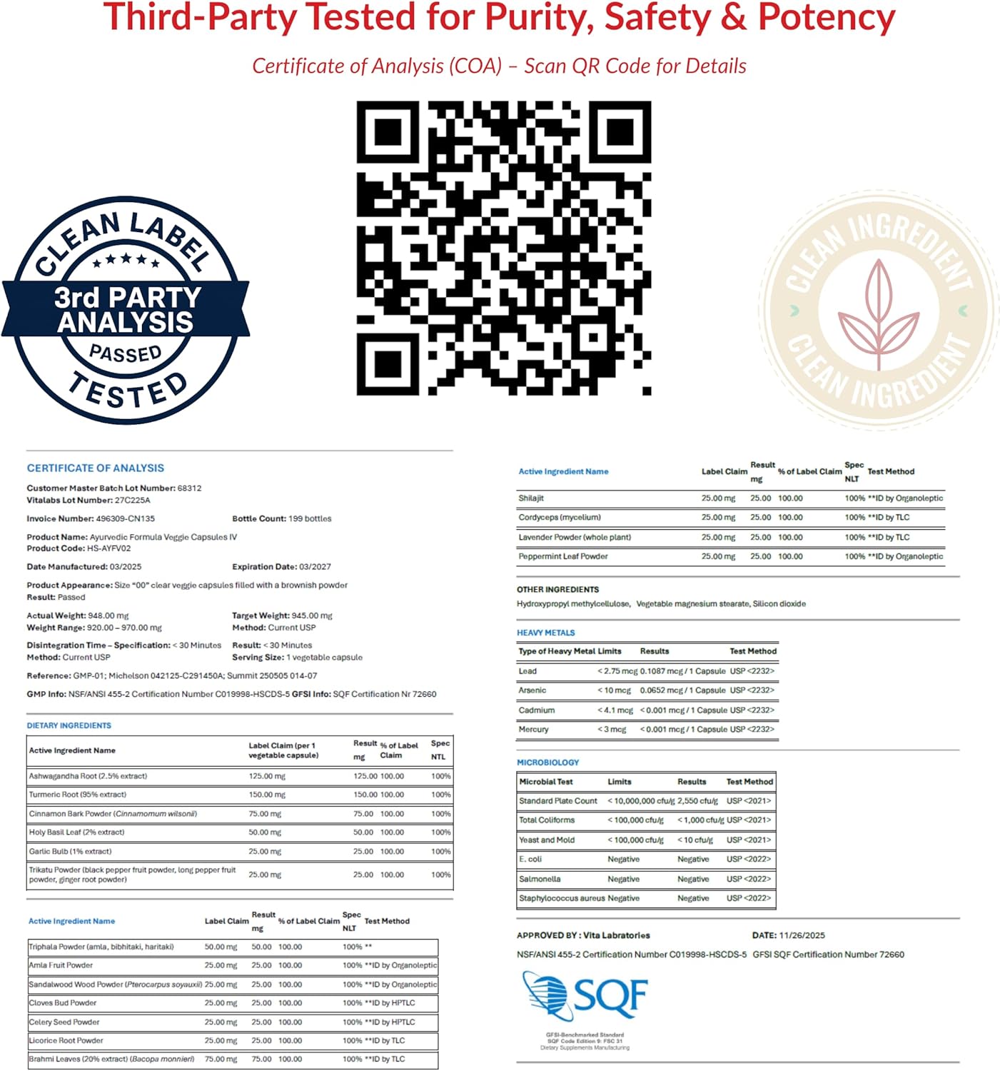 Every batch of Ayurvedic Complex is independently tested by US Laboratories (Anaheim, California). Formulation verified 100% as claimed. Heavy metals tested well below USP limits. Full Certificate of Analysis available via QR code on label.