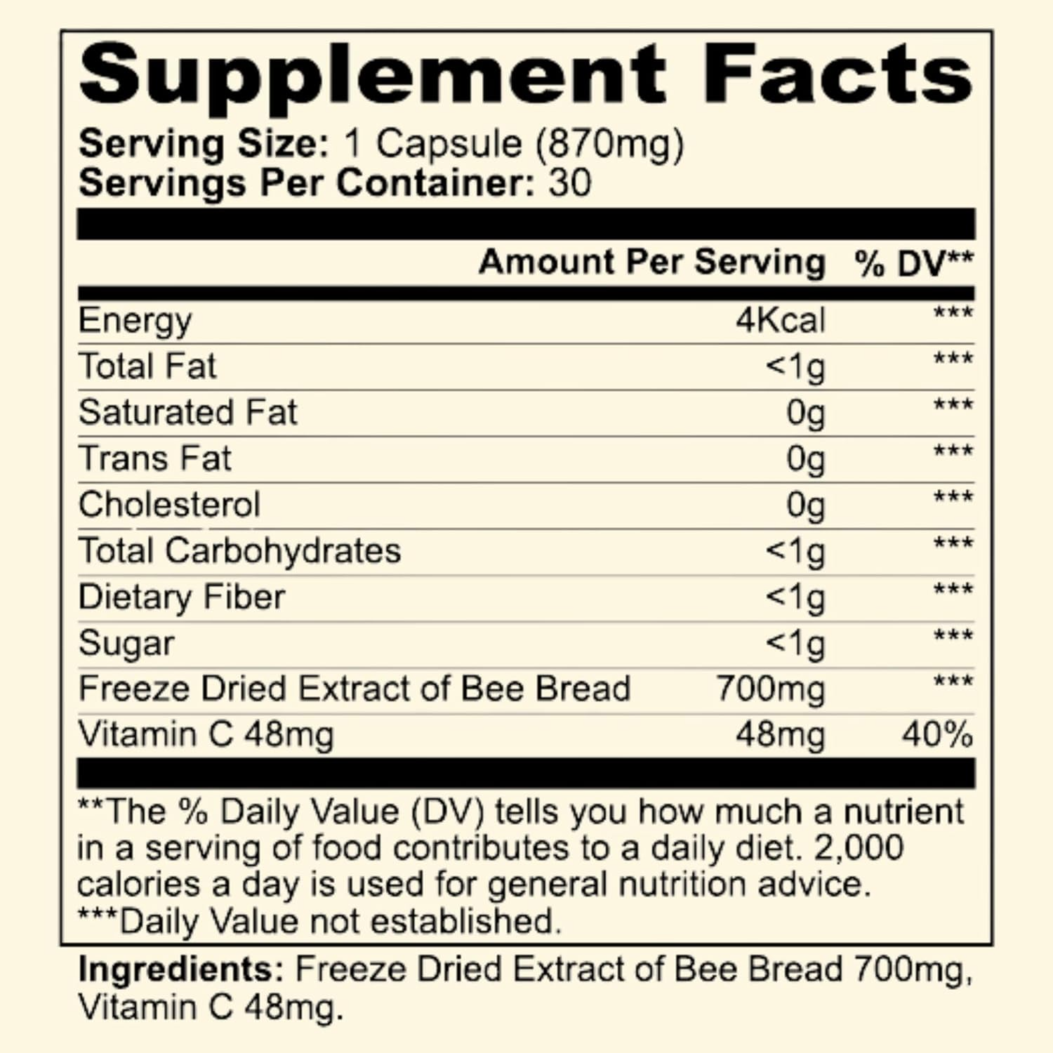 Ingredients: Freeze-Dried Extract of Bee Bread 700mg, Vitamin C 48mg, Hydroxypropylmethylcellulose (capsule shell).
