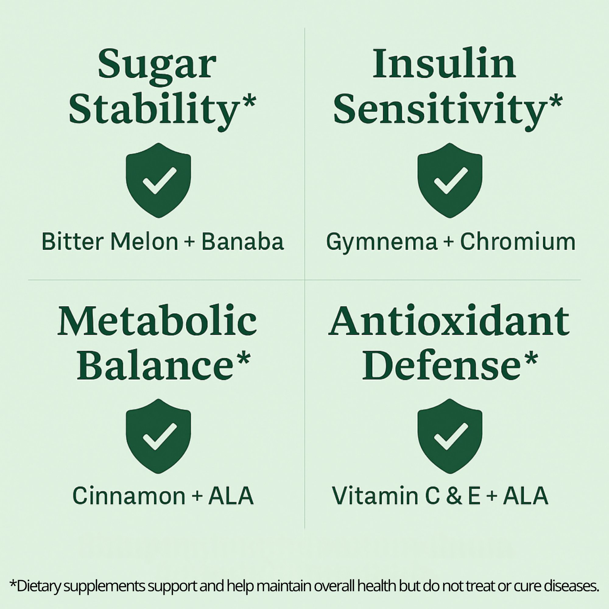 | Blood Sugar Blend Bitter Melon, Cinnamon, Gymnema, Banaba, L-Taurine, Mulberry, Yarrow, Cayenne, ALA, Juniper Berry, DGL Licorice | 620 mg | ** |