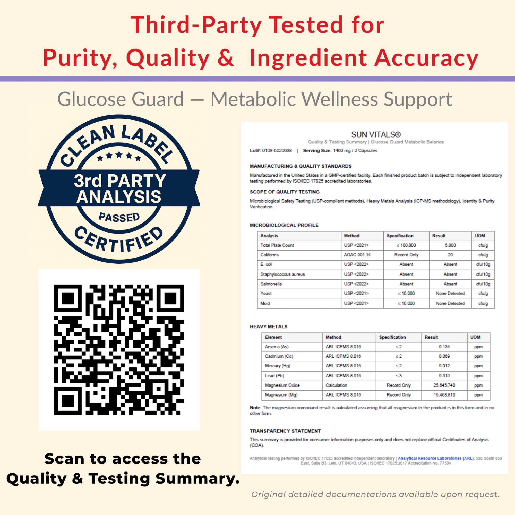 Every batch is independently tested for ingredient accuracy, purity, and heavy metals. Full Certificate of Analysis available via QR code on the product label. GMP-certified manufacturing in the USA.