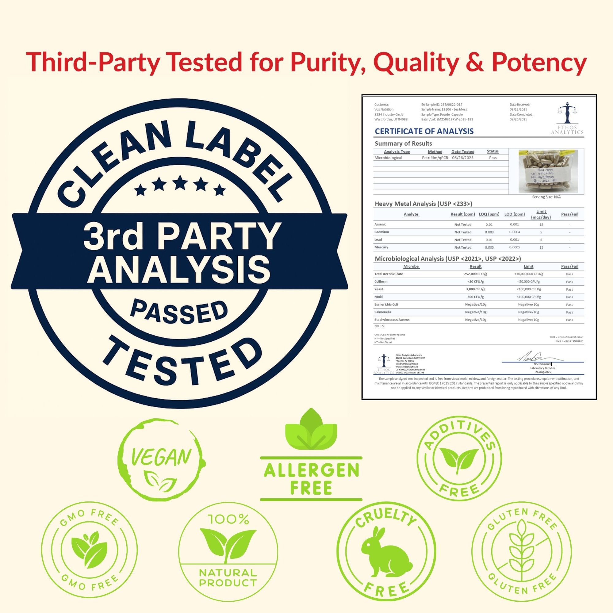 Each batch of Moss Fusion Complex is independently tested by Ethos Analytics (ISO/IEC 17025 accredited) for microbiological safety and heavy metals. Clean Label — Analysis Passed. Microbiological tests including E.coli, Salmonella, and Staphylococcus Aureus all negative.