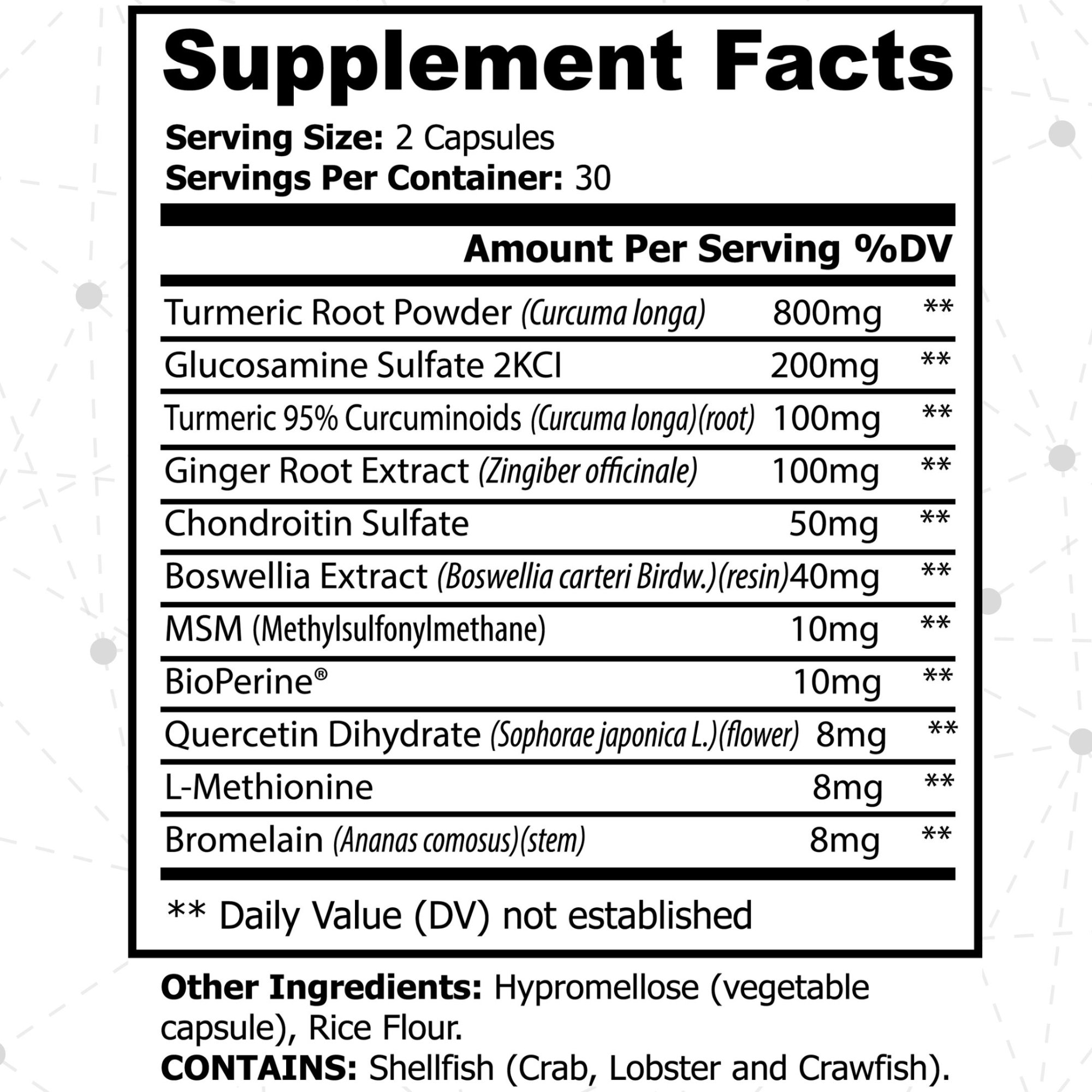 ⚠ CONTAINS: Shellfish (Crab, Lobster and Crawfish) from Glucosamine source.